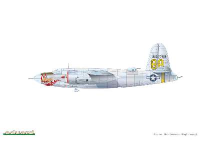 The beginnings of the 397th Bombardment Group hails back to April 20th, 1943, at MacDill in Florida, where the unit began to train on the B-26 Marauder. After relocating to Great Britain, the first combat mission was an attack on a V-1 base in the vicinity of Pas de Calais, exactly a year after the formation of the unit. Natural metal aircraft of the 397th BG carried markings that included a yellow diagonal band across the vertical tail surfaces. At the time of the invasion, the so-called D-Day stripes were added to the fuselage and wings. Unit members added a silhouette of the United States on the nose of this aircraft, along with a well endowed lady with the inscription THE MILK RUN SPECIAL. Bomb silhouettes symbolized the number of bombing missions.